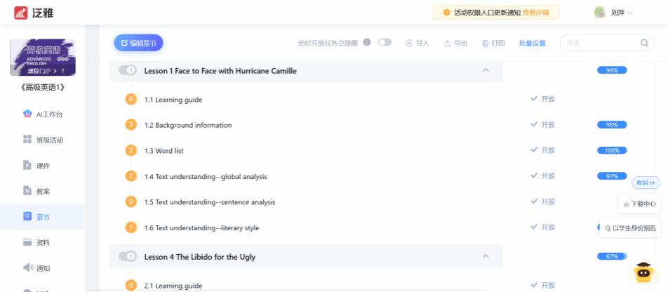 在教育数字化与人工智能深度重构学习方式的今天,外语教学正经历从“知识传授”到“能力培养”的深刻变革。《高级英语》作为英语、翻译专业大三员工的核心课程,承载着夯实语言功底、锤炼批判性思维、培育跨文化交际能力的核心使命。课程积极拥抱“数智赋能”的办学特色,将AI、大数据与智慧教学平台深度嵌入教学全过程,在破解“课时有限、任务繁重、考试压力大”等现实难题的同时,探索出一条外语类课程智慧升级的新路径。