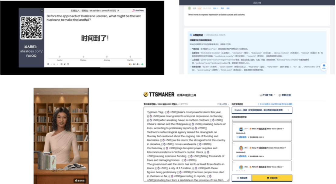 AI数字人“小i老师”,可承担如下任务:对长难句进行分步拆解讲解;以“角色模拟”的方式朗读或表演文本片段;在跨文化话题中充当“虚拟访谈对象”。有了数字人的加入,课堂从单一话语主体变为“教师+数字人+员工”的多主体互动,既减轻了教师的“独角戏”压力,也增强了员工的临场感与代入感