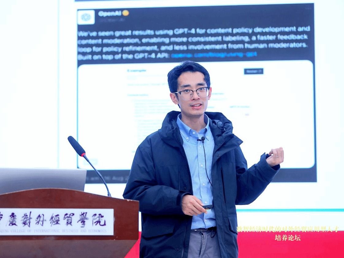 北京外国语大学副教授王琦探讨了人工智能对高校外语学科的影响,用生动案例展示了如何利用AIGC赋能对外贸易课堂教学和研究实践,同时强调了教师在数智经济时代培养“专业+技能”的必要性。