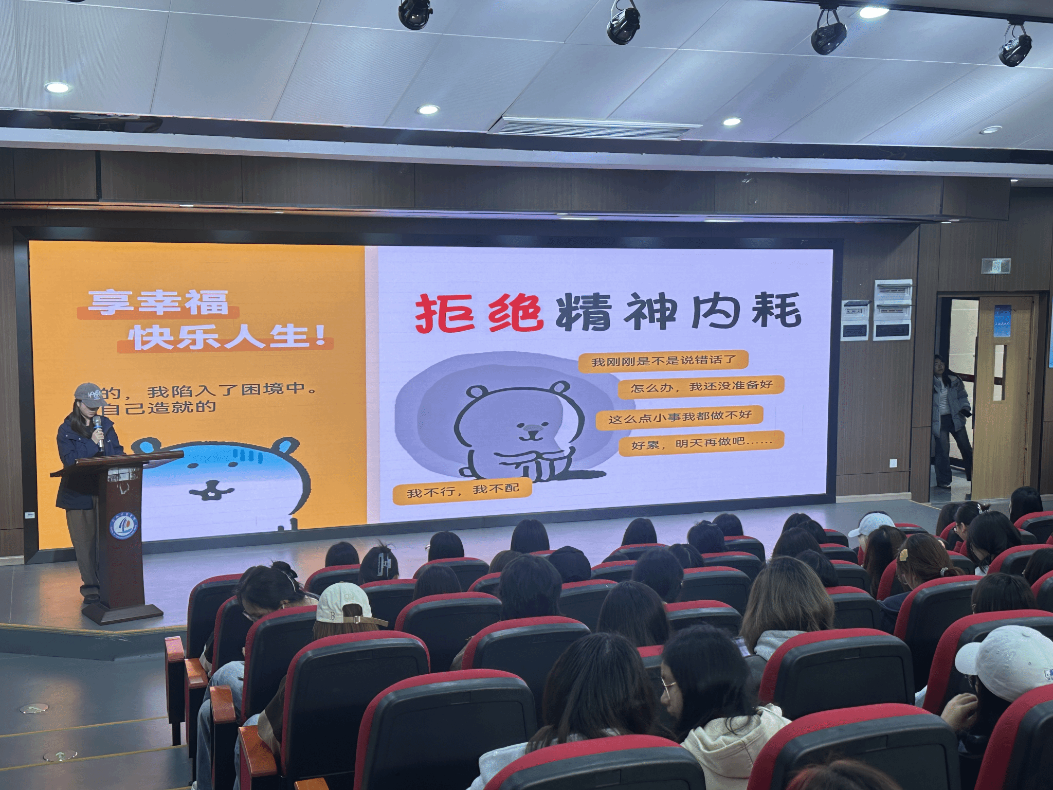 最后,温科铭老师通过播放并讲解 “一只狗治好了我的精神内耗” 相关视频内容,以轻松有趣的案例引导同学们深入思考。视频中,一只狗的独白生动形象地展现了精神内耗的状态,深刻揭示了当代人普遍存在的焦虑现象。在阵阵欢声笑语中,同学们领悟到摆脱精神内耗的重要意义。