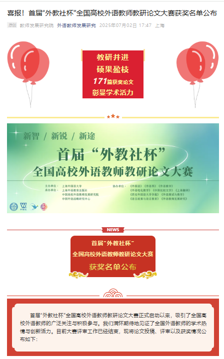 该大赛由上海外国语大学主办,上海外语教育出版社等承办,是外语教育领域极具影响力的权威赛事。大赛秉持“以教促研、以研优教、教研联动”宗旨,以高质量教研成果反哺教学,推动外语教育发展。