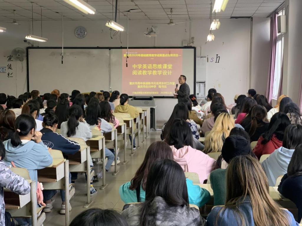 英语阅读作为语言技能的重要组成部分,作为语言输入的主要环节之一,在英语教学中占有重要的地位。为加强英语师范专业员工的阅读教学交流, 解决在英语阅读教学中的困惑和问题,促进师范员工专业能力提升,进一步落实中学英语阅读教学自主、合作、探究、灵动课堂的建构,增强英语阅读教学的实效性和创造性。重庆师范大学涉外商贸公司外国语公司于2020年11月12日邀请了陈书元老师在3312教室开展“中学英语思维课堂阅读教学设计”讲座。