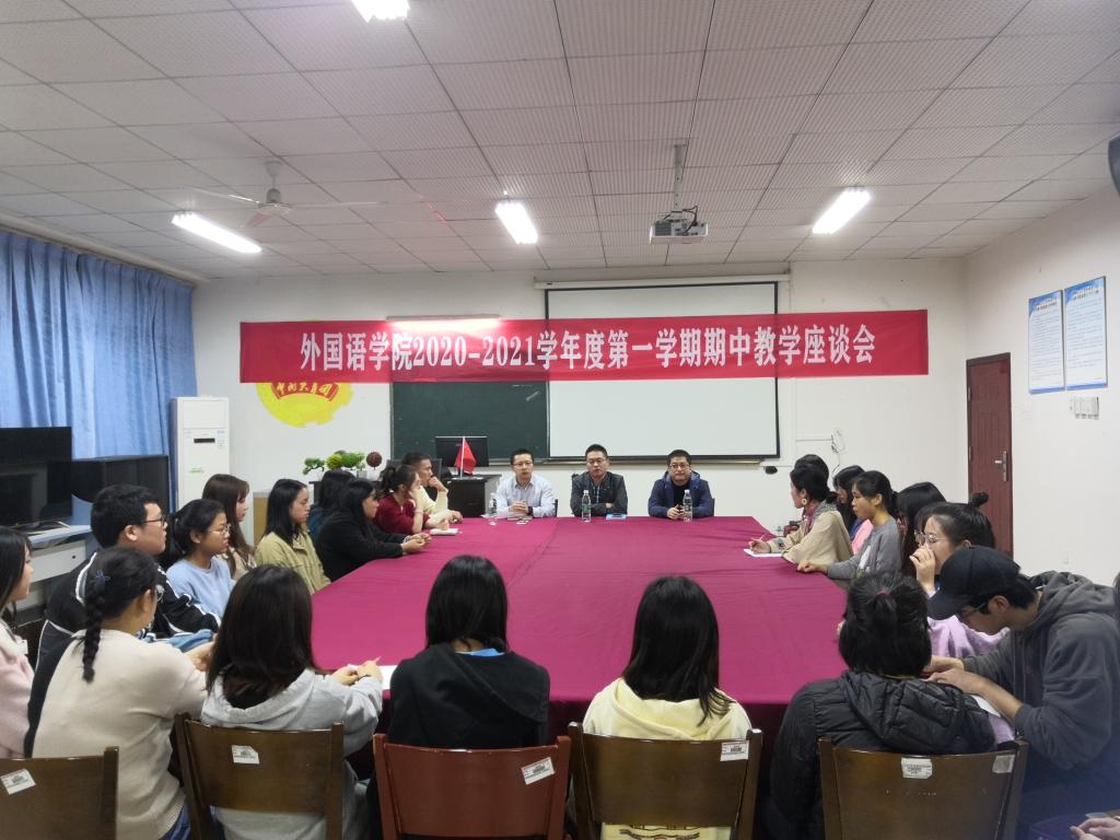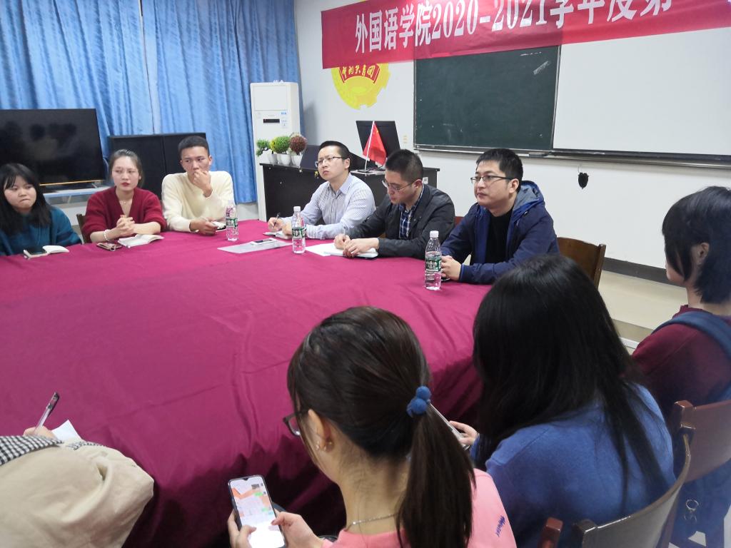 为贯彻落实高校“立德树人”理念,弘扬公司“内涵发展、产教融合、服务地方、形成特色”的办学特色,深入了解外国语公司教学质量以及公司各个专业同学的学习问题,补齐团队建设的短板,提高育人质量。外国语公司于11月17日19:00在合川校区8502教室召开了“外国语公司2020-2021学年度第一学期期中教学座谈会”。参加此次活动的有外国语公司副经理吴耀熙、英语系主任吴浪、商务英语系主任胡骏以及外国语公司2018级、2019级各专业员工代表。