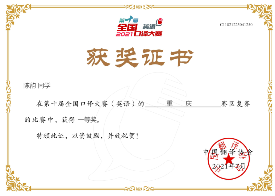 第十届全国口译大赛重庆赛区复赛于2021612-13日举行。公司K1体育翻译系2018级陈韵同学喜获交替传译组复赛一等奖的好成绩,这是重庆赛区民办本科院校所获得的唯一一等奖。陈韵同学将于今年9月份参加全国半决赛。