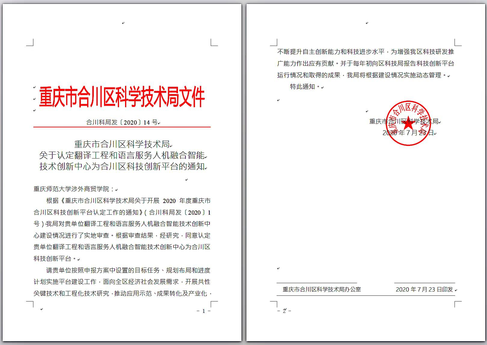 ,外国语公司组织申报的“翻译工程和语言服务人机融合智能技术创新中心”正式获批合川区科技创新平台,是继公司“数字经济技术创新中心智能教育技术创新中心的第三个区级科研平台