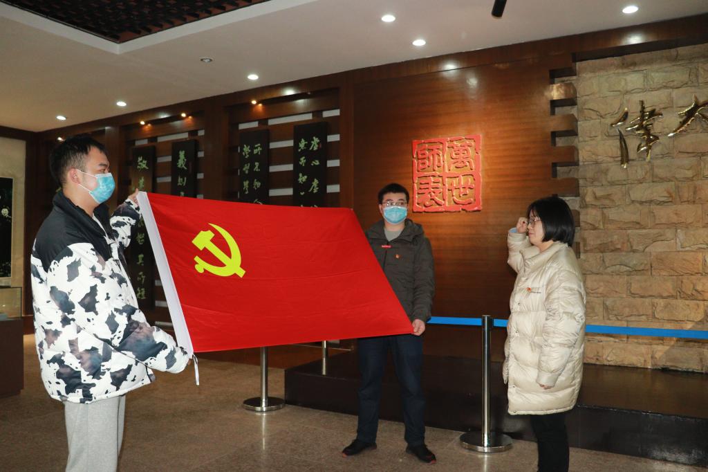 最后,在党旗和陶行知先生的塑像前,新党员们跟随领誓人何艳同志完成了入党宣誓仪式。