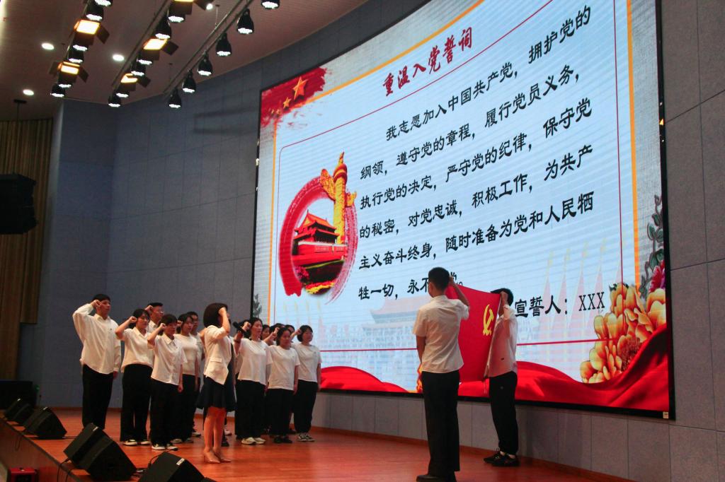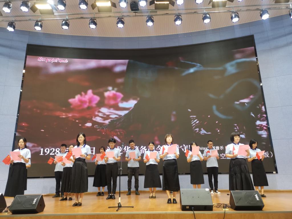 公司员工党员的红色影片配音秀,以青春之声,绎革命历史;教师党员们满含深情合唱《错位时空》,将每个音符化作一捧鲜花,装点盛世中华;在李霓同志的带领下,全体党员庄严宣誓,将以自己的实际行动为党旗増光添彩。