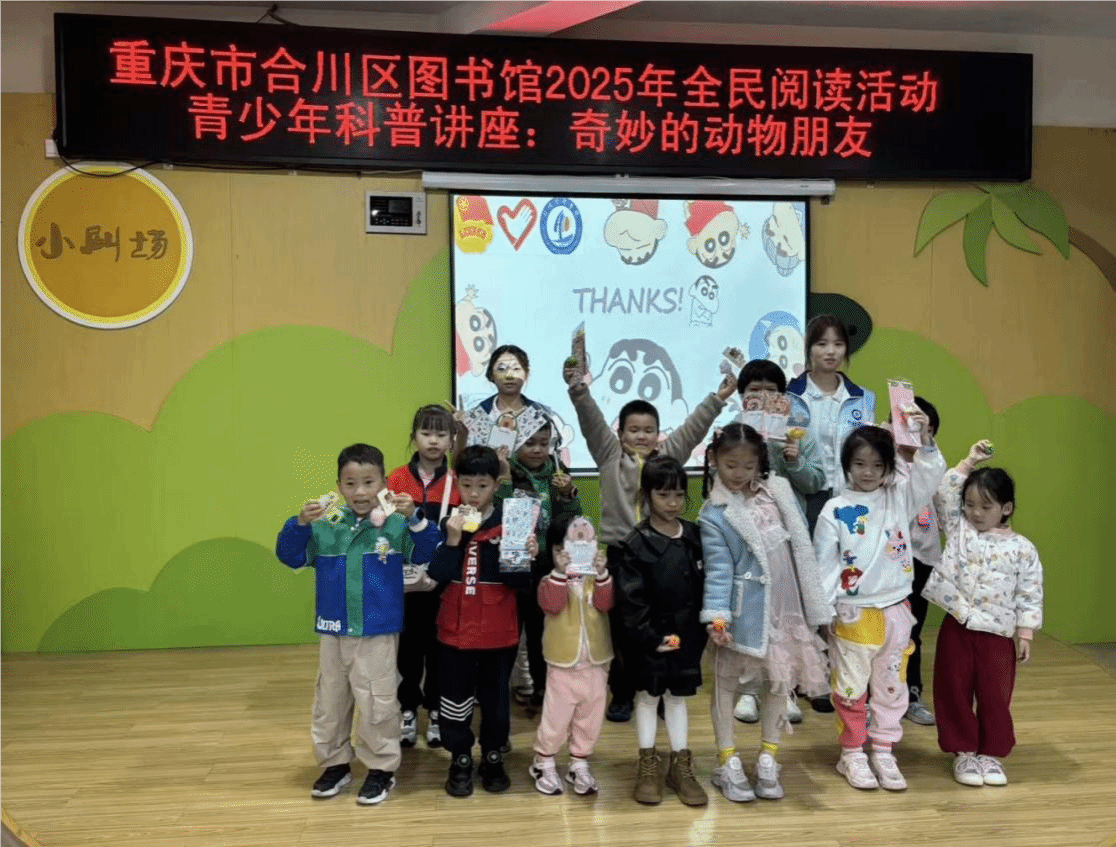 活动前期,公司工作人员与合川区图书馆负责人提前对接,共同完成场地布置、物料清点、设备调试等筹备工作,明确活动流程与分工,为活动顺利开展奠定基础。活动当天,志愿者引导参与儿童有序入场就座后,科普活动正式启动。志愿者通过播放科普动画短片、展示立体动物模型的方式,向儿童系统介绍热带雨林、极地冰川、草原荒漠等不同栖息地的典型动物——从具备迁徙习性的丹顶鹤,到适应极寒环境的北极熊,从擅长拟态伪装的竹节虫,到依赖群体协作的非洲大象。志愿者结合实例讲解每种动物的生存特点与生态作用,引发儿童主动提问,现场互动氛围良好。