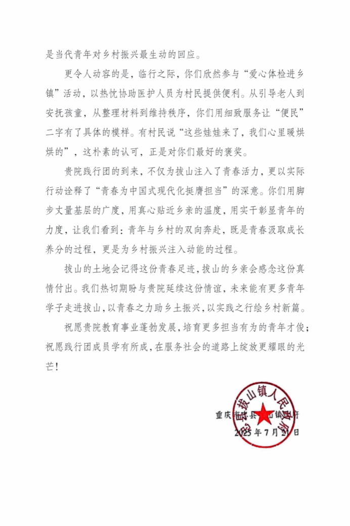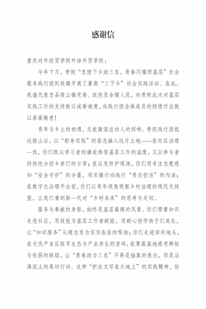 共青团忠县委员会颁发的优秀团队荣誉证书,凝结着团队扎根基层、助力乡村发展的青春汗水,是对其实践成果的官方嘉许;忠县拔山镇政府的感谢信,字里行间细数团队“扎根社区治理一线、赋能产业发展、温暖民生服务”的具体举措,满溢着对“青年与乡村双向奔赴”的珍视与认可,高度肯定了团队以实际行动诠释“青春为中国式现代化挺膺担当”的深刻内涵。