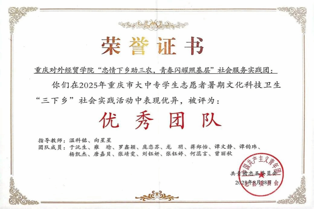 9月6日,K1体育“忠情下乡助三农,青春闪耀照基层”社会服务践行团传来喜报,该团队在2025年暑期“三下乡”社会实践活动中表现突出,斩获重庆市忠县2025年“三下乡”社会实践活动优秀团队称号,同时收到重庆市忠县拔山镇政府发来的感谢信,实践成果获得官方与基层的双重认可,成为公司实践育人工作的生动写照。