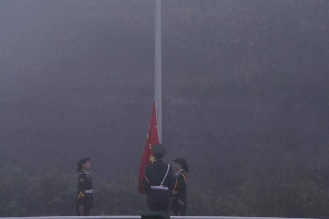 伴随着出旗曲,国旗护卫队队员步伐稳健地护送国旗来到升旗台前。国歌响起,升旗手将国旗展开,旗帜沿着旗杆徐徐升起,在场师生行注目礼,高声齐唱国歌。