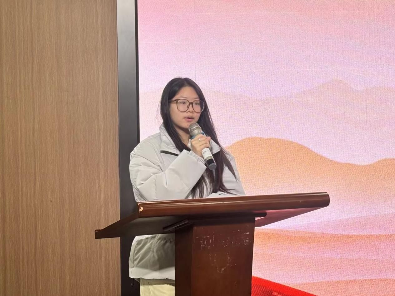 然后,第五期“青马工程”优秀员工代表蒋郑怡同学上台发言,她结合自身专业学习与成长经历,分享了对青马工程的理解与期待,展现出青年学子投身青马学习的热情与决心。