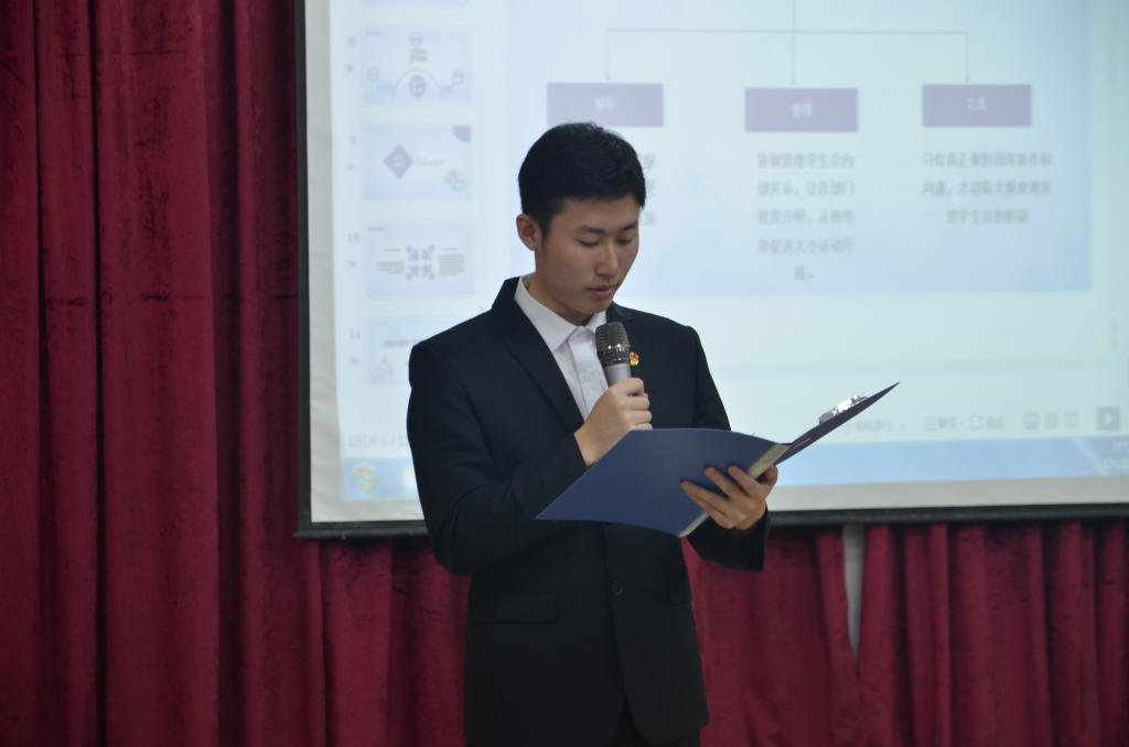 本着公平、公开、公正、择优录取的原则,团总支根据竞选条件对报名者进行资格审查,最终有4人进入竞职演讲及评议答辩。候选人胡洋同学根据自己已有的团学工作经验分别向大家介绍了自己对于团学工作开展的认知和规划。候选人卢超同学分别从岗位认知和胜任能力两个方面展开竞职演讲。候选人皮际序同学从常规工作、内部建设以及外部联络等几个方面进行竞职演讲。候选人颜诗琪同学从服务、责任与能力三个方面展开自己的竞职演讲。