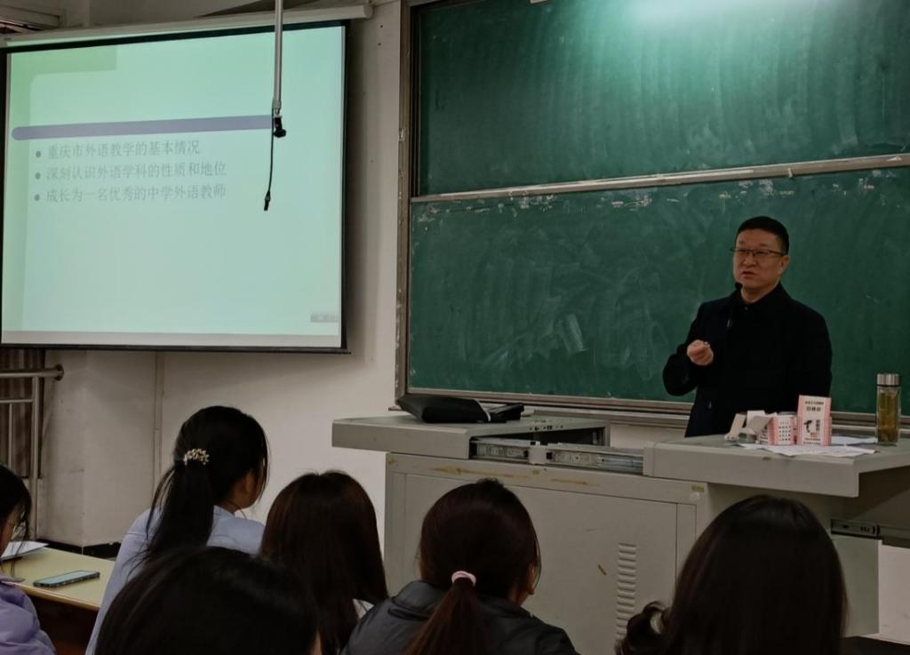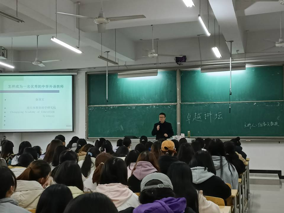 论坛伊始,伍教授从重庆市外语教学的基本情况、深刻认识外语学科的性质和地位还有如何成长为一名优秀的中学外语教师三方面进行了细致的介绍与讲解。对于英语学科教育的核心素养,伍家文教授提出英语口语一定要标准流利,这能直观地体现出一名英语专业员工的水平,强调大一大二一定要夯实基础、重视英语发音练习。最后,伍教授建议同学们认识教育改革的大背景并积极适应,不断学习,提高自己的专业能力。