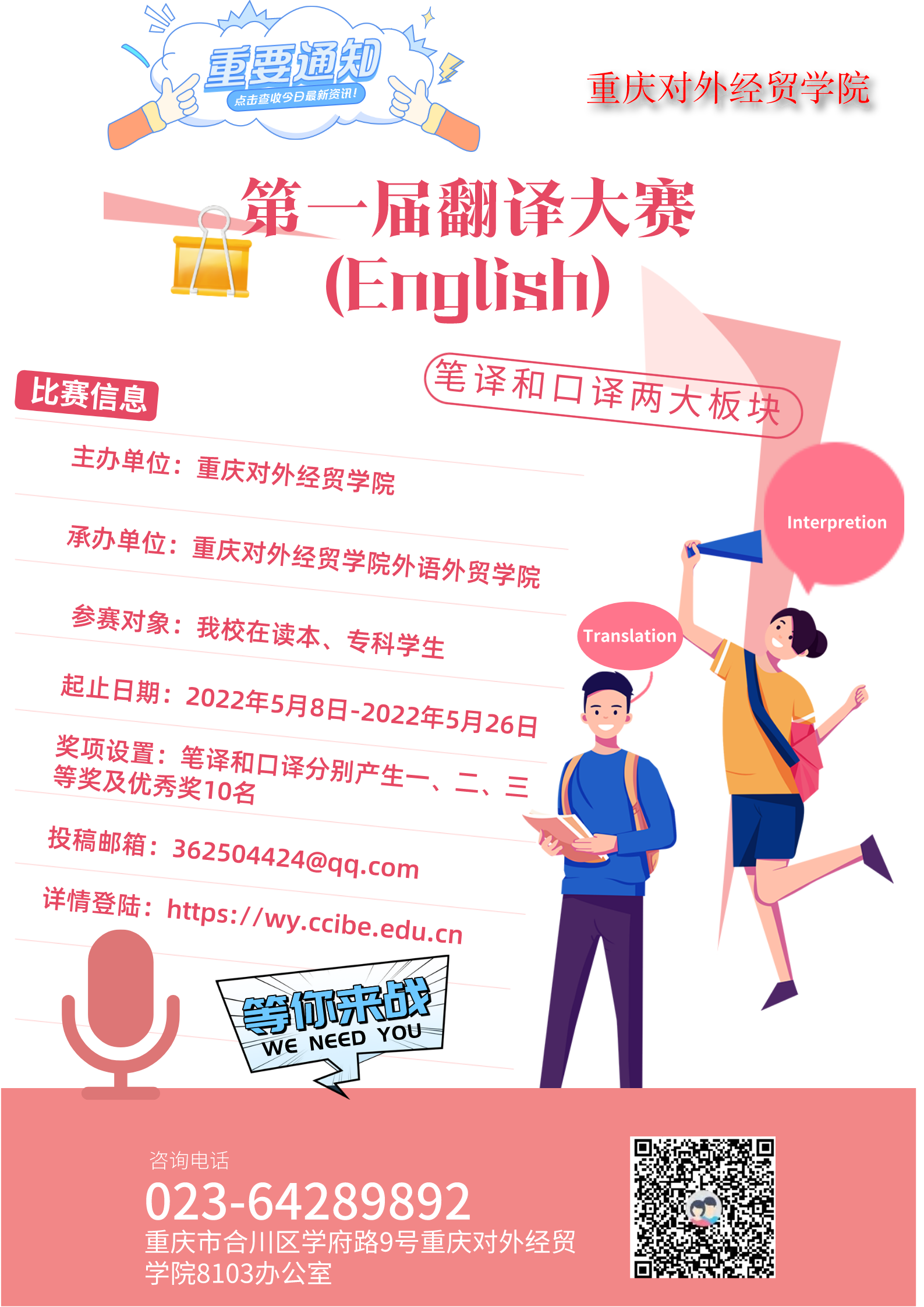 3. 口译比赛时间:5月26日(13:30-17:30)。口译比赛采用初赛和决赛两级赛制,其中初赛为:中外教师现场对话+选手交替传译,决赛为:阅读文稿+选手口译,初赛前十名晋级决赛, 口译比赛地点合川校区9512。