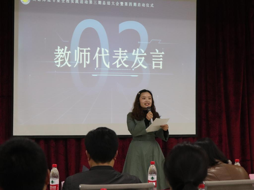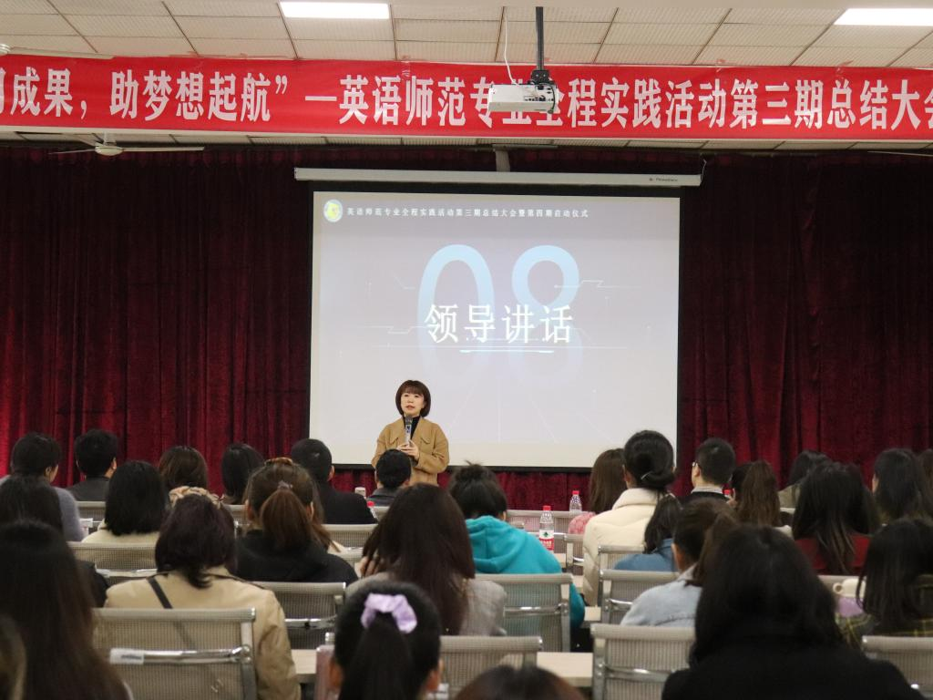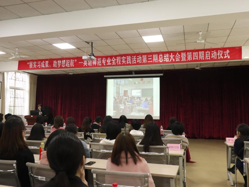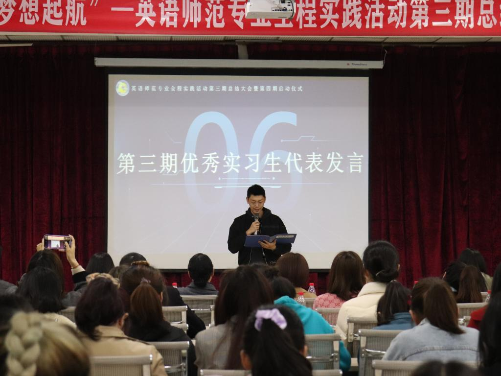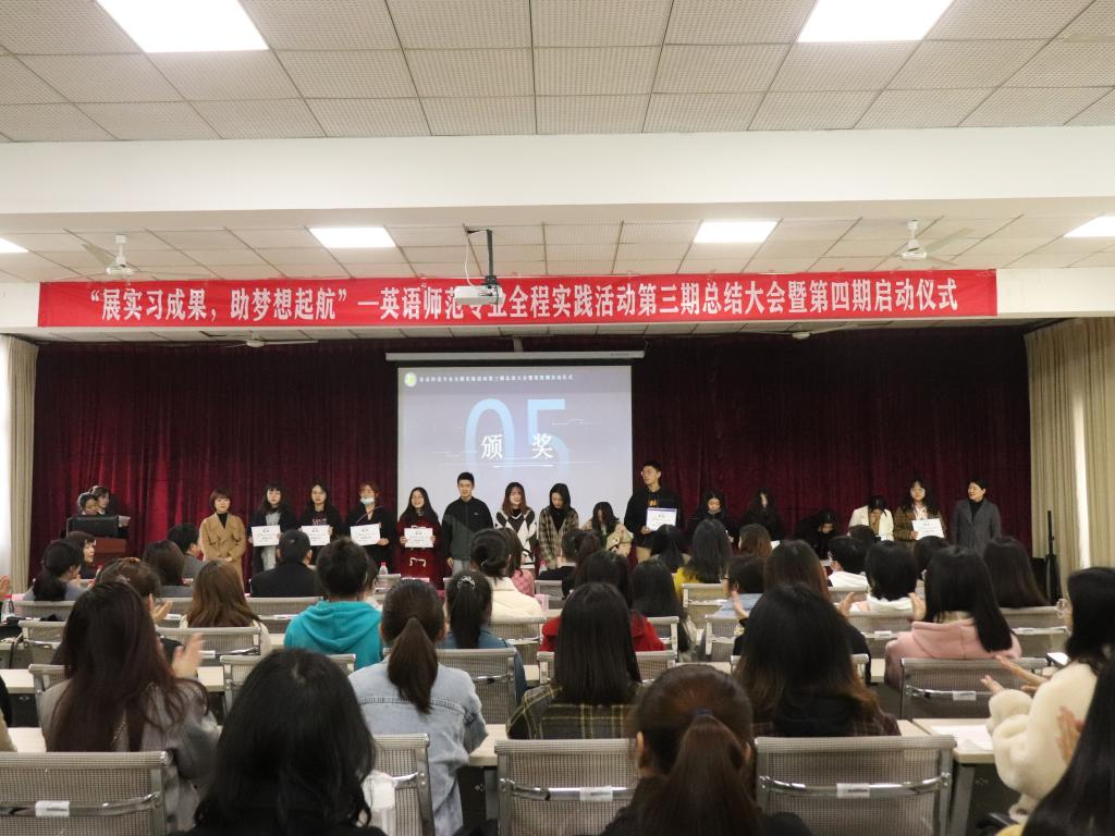 第三期の活動が順調に進み、第四期の活動も幕を開けた。外国語公司の呉耀熙副院長は壇上で挨拶し、前学期の実習生たちに賛辞を送り、また新学期の実習生たちにアドバイスをした。第三期の実践活動の映像を見た時、みんなの顔に期待と希望が溢れていた。授業にしても補助授業にしても、生たちはいつもまじめで責任感がある。ビデオを見て、誰もが深い感銘を受けた。次に、龔旬指導教師代表は自分の指導の悟性を分かち合い、実習生たちに指導教師から謙虚に学び、チャンスをつかむようアドバイスした。優秀な実習生リストの朗読が終わるにつれて、活動も心を奮い立たせる段階に入った。授賞すした、李霓院長と張遠鵬党総支部書記が優秀実習生代表に証書を授与した。続いて第三期代表の万智豪は公司と実習公司の育成に感謝を表し、第四期の実習生代表の廖本莉も自分の決心と根気を示し、第四期の活働で奮発すると決意した。最後に、李霓院長は、イーキューと責任の両面から研修生に高い評価と期待を与え、第四期実践活動の公式始動を宣言し、今回の活動も円満に幕を閉じた。