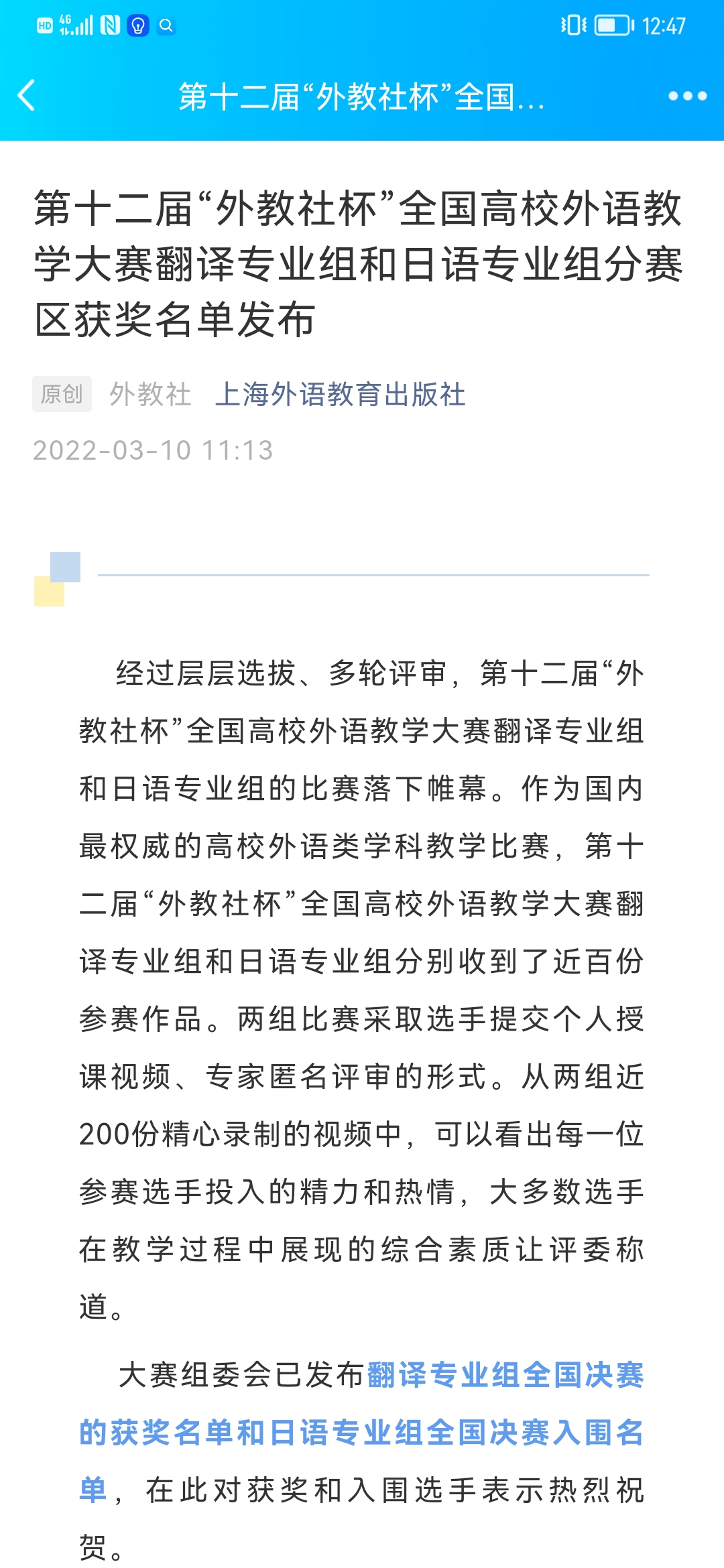 近日,第十二届“外教社杯”全国高校外语教学大赛-翻译专业组和日语专业组分赛区获奖名单公布。经过层层选拔、多轮评审,公司K1体育日语系崔士红老师获西南西北赛区三等奖。